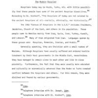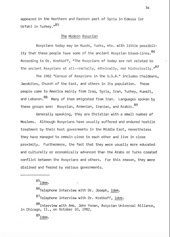 According to May Abraham’s pages (drawing on Ignace Gelb and John Joseph), the ancient Assyrian language had died out while the communities in question spoke Aramaic/Syriac; Joseph argues that today’s “Assyrians” are using the wrong name, should call themselves Chaldeans, and that what is called modern Assyrian should be called Aramaic. In this framing, “Assyrian” in the U.S. context functioned as an umbrella category that grouped Chaldeans, Jacobites, and members of the Church of the East from Iraq, Syria, Iran, Turkey, Kuwait, and Lebanon, who also used multiple everyday languages. Abraham underscores the point with two explicit claims from the text: “Assyrians today may be Kurds, Turks, etc., with little possibility that these people have some of the ancient Assyrian blood-lines,” and “The Assyrians of today are not related to the ancient Assyrians at all—racially, ethnically, nor historically” (cited by May Abraham from Dr. Kretkoff). Taken together, these statements present “Assyrian” as a modern, label-driven umbrella rather than a biologically or historically continuous identity from antiquity.