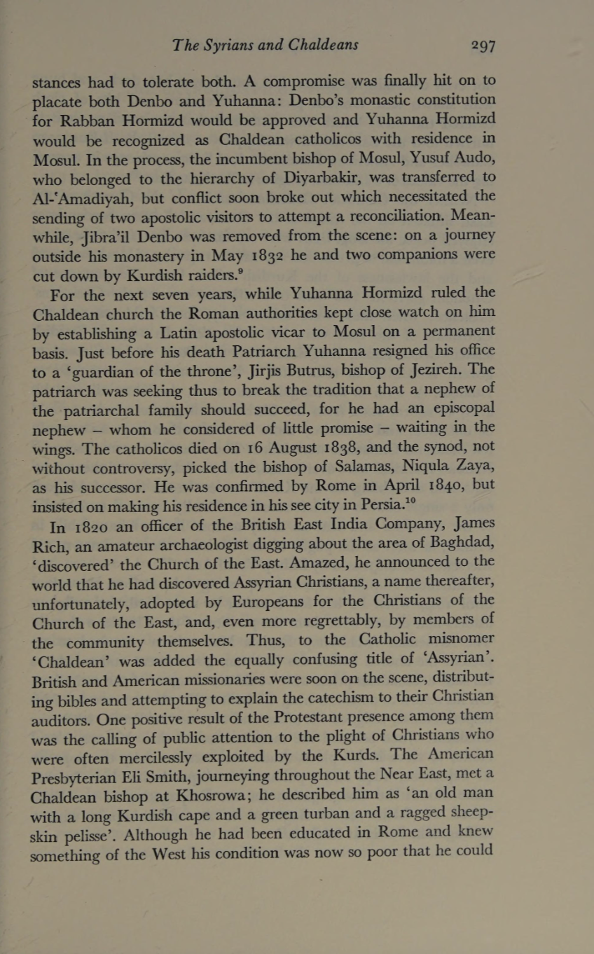 Frazee situates the naming issue inside a concrete 19th-century history of the Church of the East and the emerging Chaldean Catholic hierarchy. He recounts the Roman attempt to stabilize the Mosul area by recognizing Yuhanna Hormizd as Chaldean catholicos in Mosul while approving Rabban Hormizd monastery’s constitution under Jibra’il Denbo. Tensions followed: Bishop Yusuf Audo of Mosul was shifted to Al-‘Amadiyah; two apostolic visitors were dispatched to reconcile factions; and in May 1832 Denbo and two companions were cut down by Kurdish raiders. Rome then kept a close watch by establishing a permanent Latin apostolic vicarage in Mosul. When Patriarch Yuhanna resigned shortly before his death on 16 August 1838, the synod chose Niqula Zaya, whom Rome confirmed in April 1840, though he insisted on residing in his Persian see.