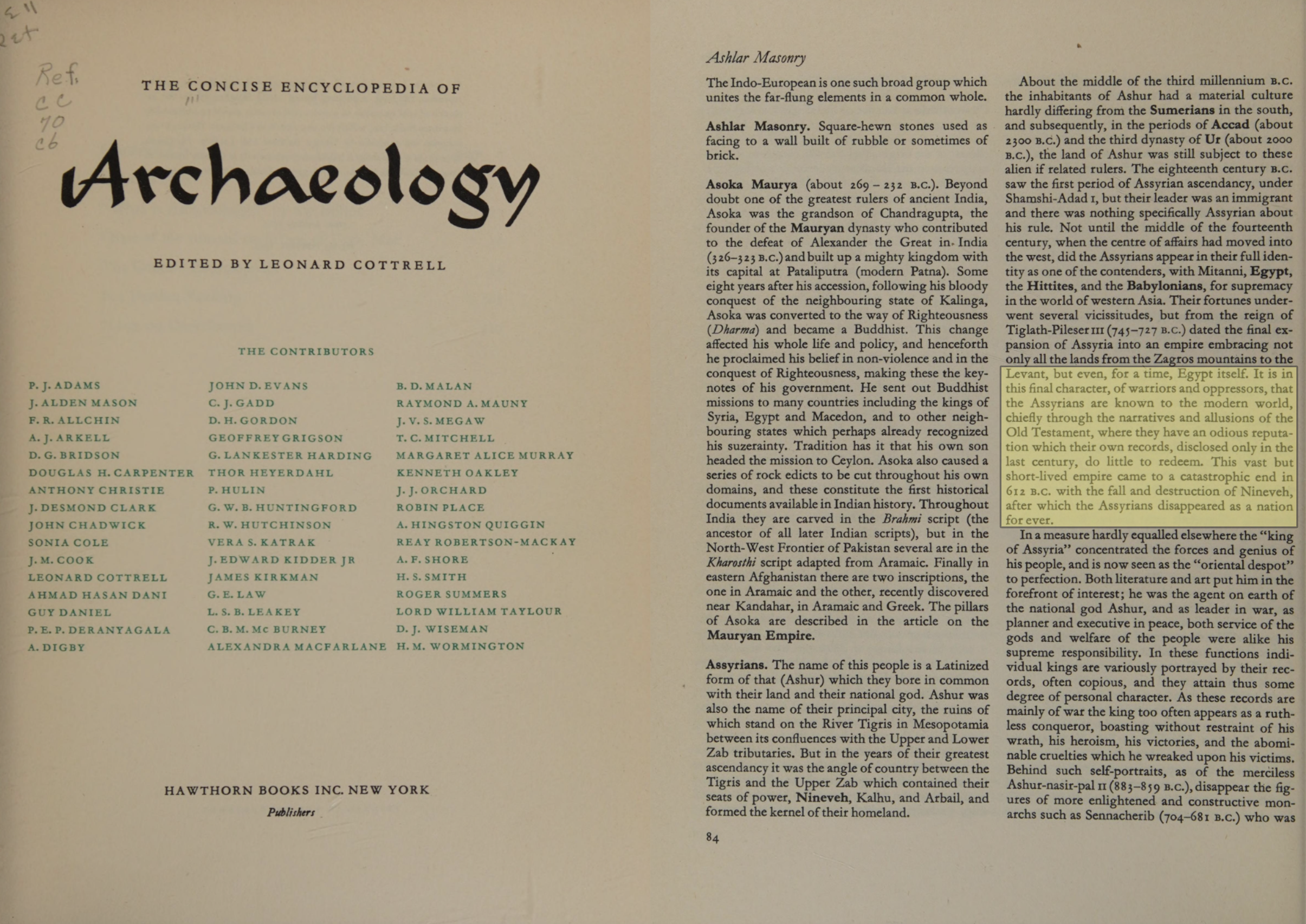 - Leonard Cottrell’s edited volume The Concise Encyclopedia of Archaeology, a collaborative work by 48 contributing scholars specializing in history and languages, explains that Assyrian power ended catastrophically with the sack of Nineveh in 612 BC. From that point, the Assyrians “disappeared as a nation for ever.” The entry adds that their modern image is mediated largely through Old Testament narratives and, more recently, through the decipherment of their own inscriptions, while emphasizing that no Assyrian nation survived beyond the seventh century BC.
