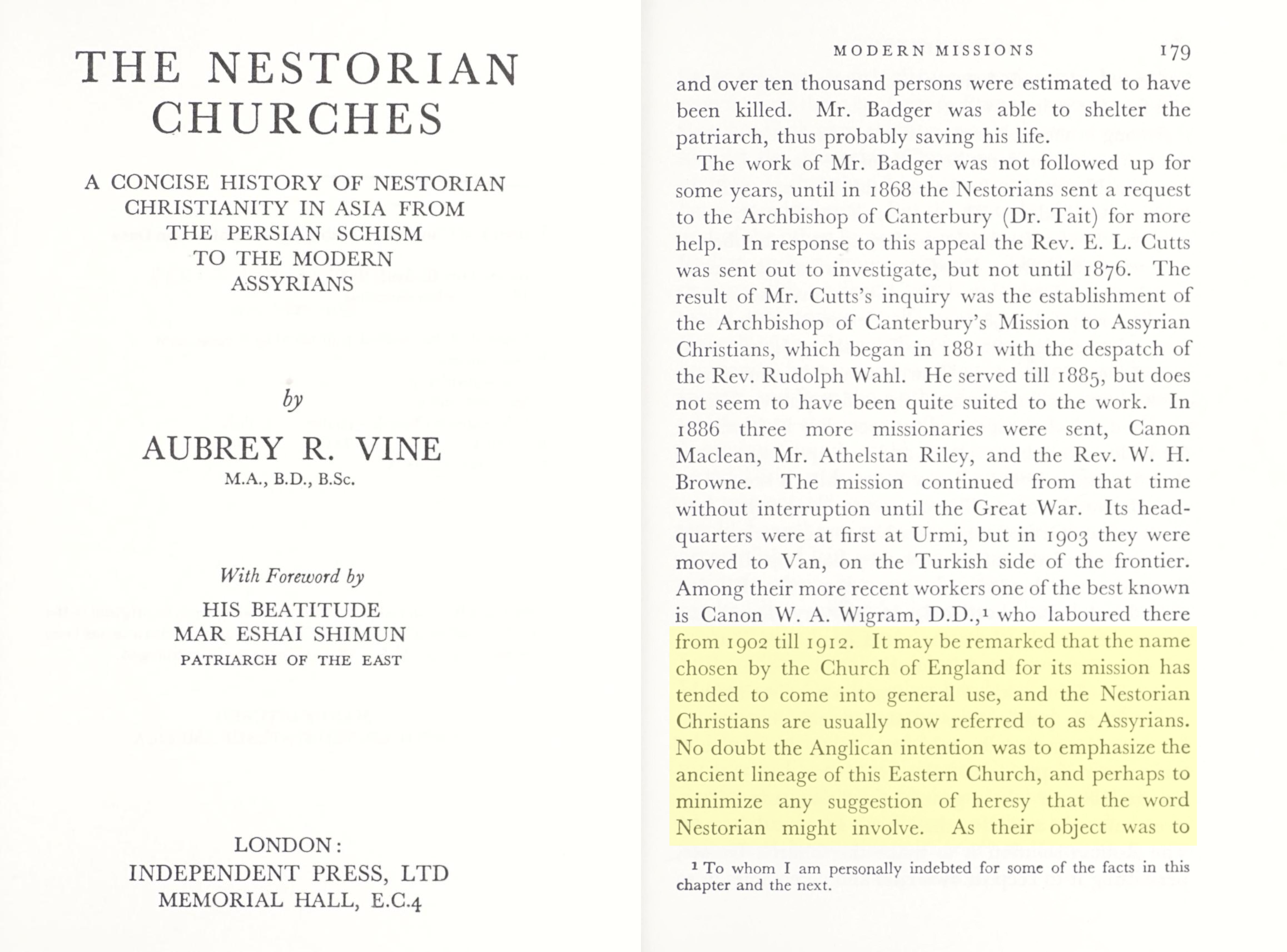 Vine explains that late 19th century Anglicans deliberately adopted “Assyrian” as the title for their mission among the East Syriac Nestorians. The Archbishop of Canterbury’s Mission used it in reports, school charters, and correspondence, and the term soon spread into wider English usage, so that newspapers, missionary journals, and general readers spoke of Assyrian Christians rather than Nestorians. The choice was both strategic and pastoral: it emphasized the community’s rootedness in the old Assyrian heartland, and it avoided the polemical associations of “Nestorian,” a term long tied to heresy and theological controversy. The new name also gave the community a dignified ethnonym that Western audiences could respect, while allowing Anglicans to support and reform the church without reopening ancient doctrinal debates.