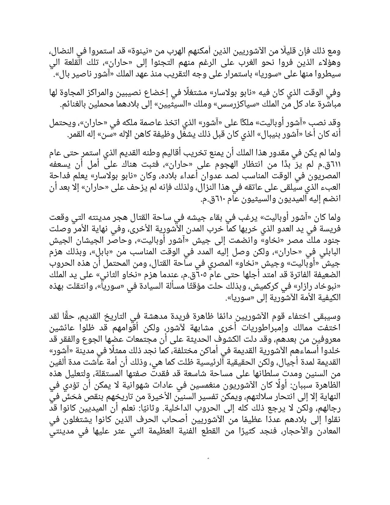 and extended its rule over a vast area, lost its independence. There are two reasons for this phenomenon: First, the Assyrians were immersed in sensual customs that could only lead to the suicide of their lineage, and the last two centuries of their history can be explained by a noticeable decline in their men, but this is not entirely due to internal wars. Second, we know that the Medes had brought a large number of Assyrian craftsmen who worked in metals and stones to their country, and we find many great works of art that were found in the cities of