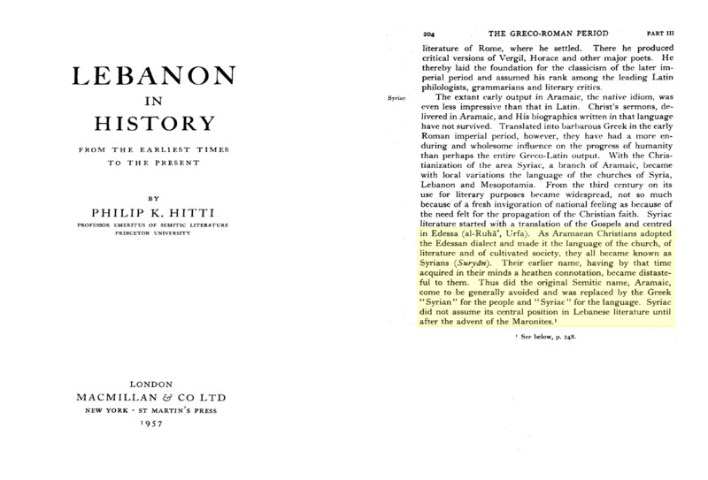 Philip K. Hitti writes that early Aramean Christians adopted the Edessan Syriac dialect for church, literature, and cultured life. Over time they came to be known as “Syrians” (Suryani), while their earlier name “Aramean” fell from use because it had gained a pagan connotation. In this usage, “Syrian” referred to the people and “Syriac” to the language, which later took a central place in Lebanese literature with the rise of the Maronites.